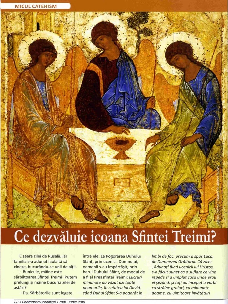 Sfanta treime descrierea icoanei in fundalul icoanei, cortul lui avraam este infatisat asemenea unui palat sau asemenea templului, si stejarul de la mamvri, amintind de pomul vietii.. În prezent originalul se află la galeriile tretiakov din moscova. Hit enter to search or esc to close search. Tema teologica fundamentala a sarbatorii cincizecimii este expunerea dogmei sfintei treimi. Cu timpul, au dispărut încetul cu încetul elementele istorice, accentul căzând doar pe reprezentarea sfintei treimi. Si, de asemenea, pentru ca aceasta icoana corespunde cel mai bine invataturii bisericii. În folosul elementelor respective se folosesc folie de aur sau de argint, ornamente în relief suplimentare și diferite tehnice.. Romania 0745 492 896 comenzileonline@yahoo.com.