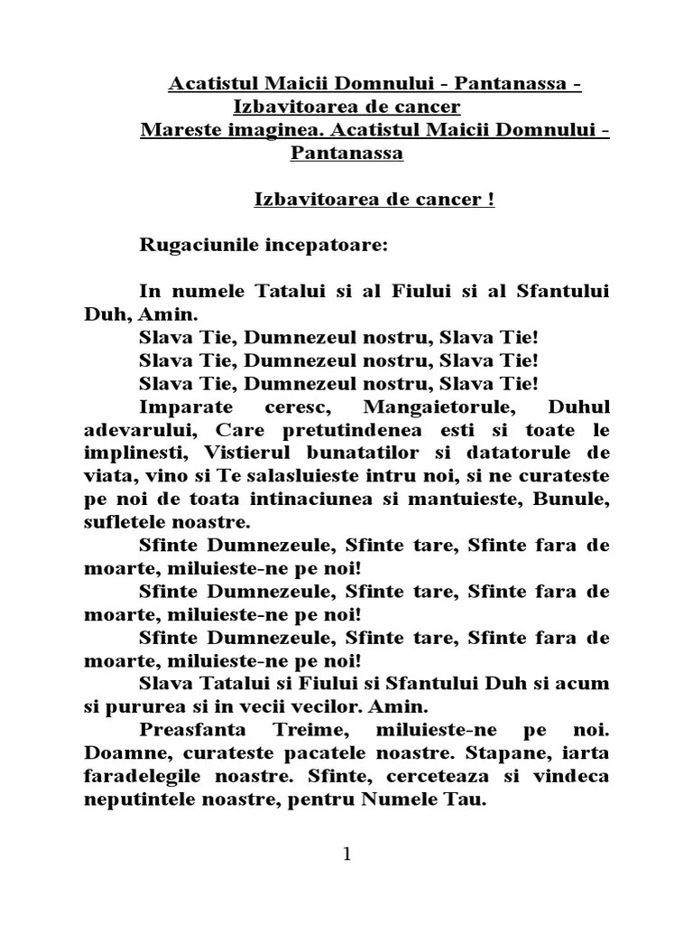 Acatistul pentru vindecarea de cancer, către icoana maicii domnului „pantanassa" acatist către maica domnului, pentru izbăvirea de patima beției, înaintea icoanei „potirul nesecat" rugăciune către maica domnului pentru vindecarea de boli; O, preacurată maică a domnului, a puterilor de sus, împărăteasa cerului și a pământului, atotputernică apărătoare și tărie a noastră, primește această cântare de laudă și de mulțumire de la noi, nevrednicii robii tăi. Acatistul pentru vindecarea de cancer, către icoana maicii domnului „pantanassa" acatist către maica domnului, pentru izbăvirea de patima beției, înaintea icoanei „potirul nesecat" rugăciune către maica domnului pentru vindecarea de boli; Înalță rugăciunile noastre la tronul lui dumnezeu și fiul … Acatistul sfântului ierarh spiridon, episcopul trimitundei.. O, preacurată maică a domnului, a puterilor de sus, împărăteasa cerului și a pământului, atotputernică apărătoare și tărie a noastră, primește această cântare de laudă și de mulțumire de la noi, nevrednicii robii tăi.