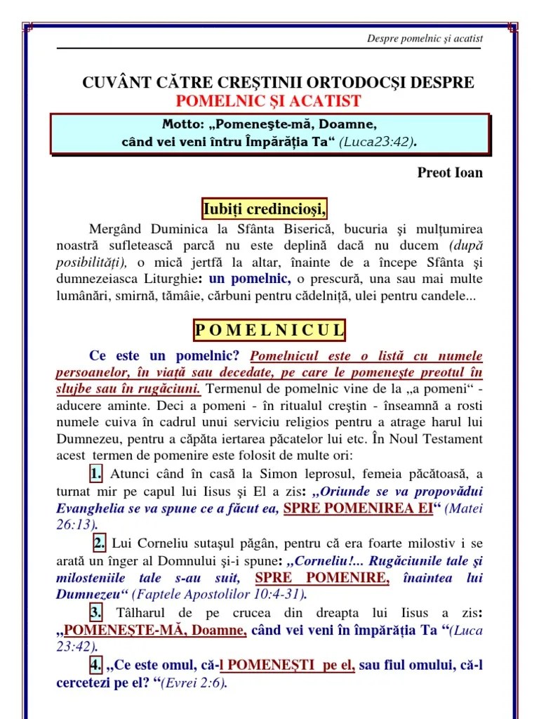 Slava tie, dumnezeul nostru, slava tie! Pomelnic cu numele persoanelor decedate, pe care le pomeneşte preotul în timpul sfintei liturghii fiind cea mai mare rugăciune ce se poate face pentru un suflet răposat. Slava tie, dumnezeul nostru, slava tie! Acatistul sfântului apostol şi evanghelist luca: Rugăciune pentru mântuirea celor adormiți.