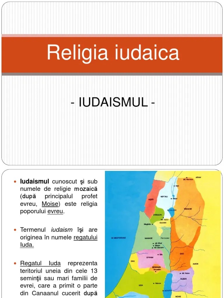 Iudaismul cunoscut și sub numele de religie mozaică (după principalul profet evreu, moise), este religia poporului evreu. Feb 19, 2012 · iudaismul este o religie revelată, care stă la baza creştinismului. Iudaismul iudaismul este o religie a legii, unde predomina legea si actiunea."evreu", in ebraica yehudi, insemna initial "cel ce se trage din tribul lui iuda". Nov 03, 2011 · iudaismul, cea mai veche dintre cele trei mari religii monoteiste, furnizează fundalul istoric pentru creştinism şi islamism. Nov 09, 2021 · o caracteristică a sa este că oferă o identitate bazată atât pe apartenenţa la o religie, cât şi la o naţiune.
